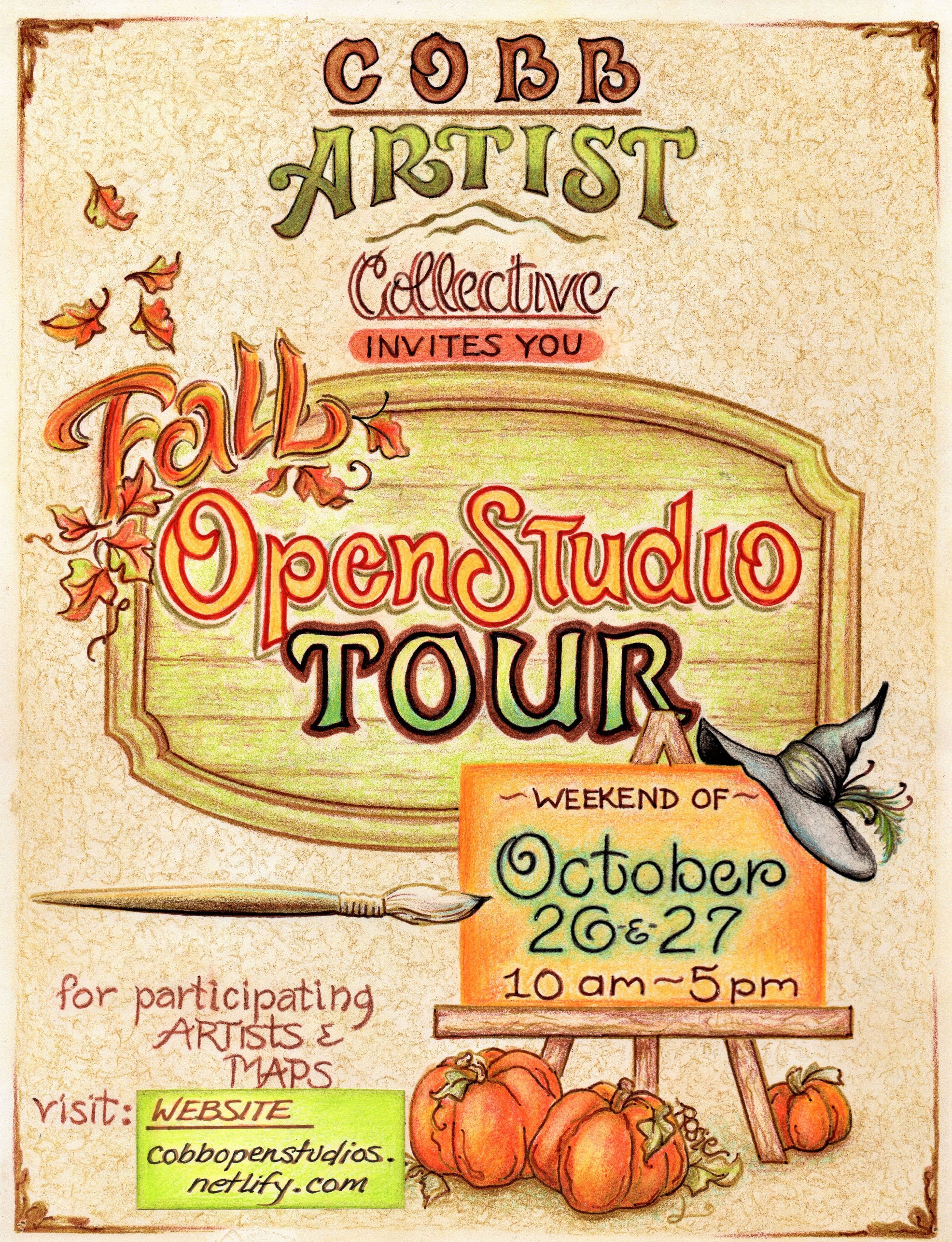Fall Open Studio PosterMedia: Pen & Colored PencilSize: 8.5” x 11”Illustrated promotional poster for the Cobb Artist Open Studio Tour